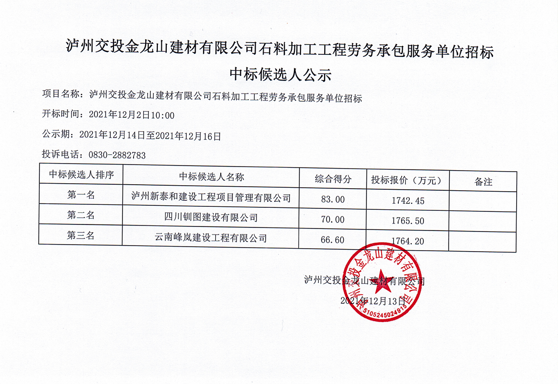 金龍山公司石料加工勞務承包服務單位中標候選人公示