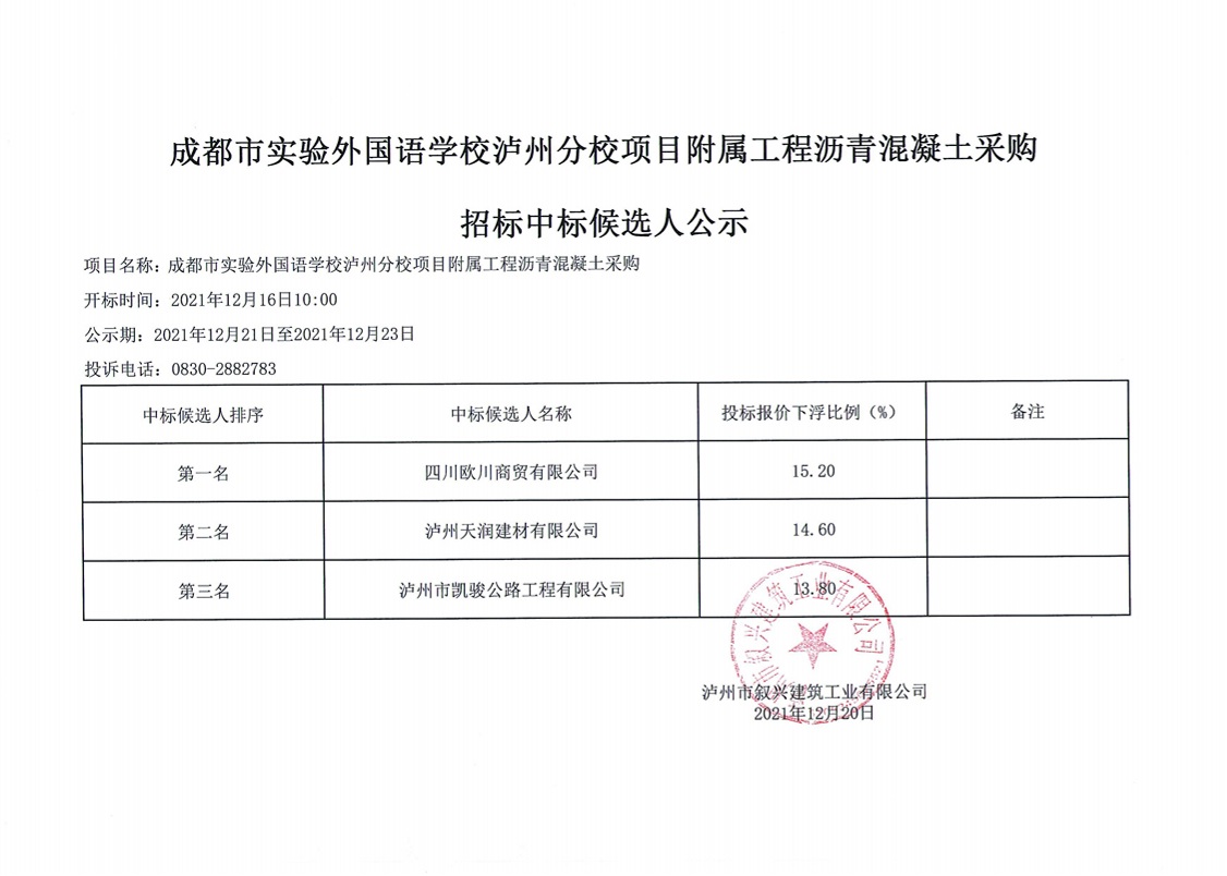 成都市實(shí)驗(yàn)外國語學(xué)校瀘州分校項(xiàng)目附屬工程瀝青混凝土采購招標(biāo)中標(biāo)候選人公示 作者: 來源: 日期:2021-12-20 瀏覽次數(shù): 次 【字體:小 大】 【打印正文】