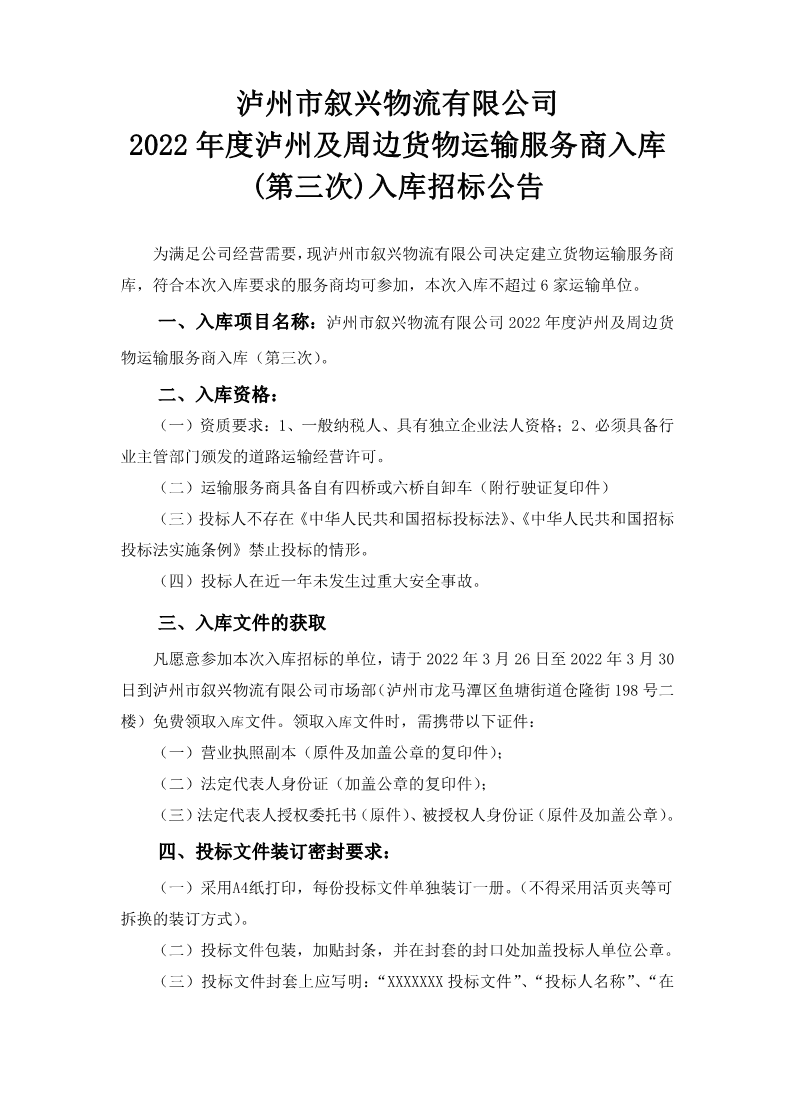 瀘州市敘興物流有限公司2022年度瀘州及周邊貨物運(yùn)輸服務(wù)商入庫(kù)招標(biāo)公告(第三次) 作者: 來(lái)源: 日期:2022-03-25 瀏覽次數(shù): 次 【字體:小 大】 【打印正文】