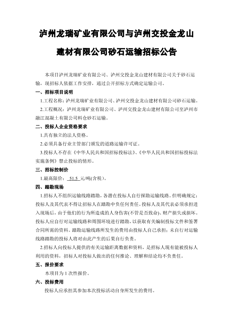 瀘州龍瑞礦業(yè)有限公司與瀘州交投金龍山建材有限公司砂石運輸招標公告