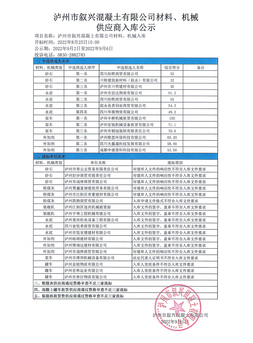 瀘州市敘興混凝土有限公司材料、機(jī)械供應(yīng)商入庫公示