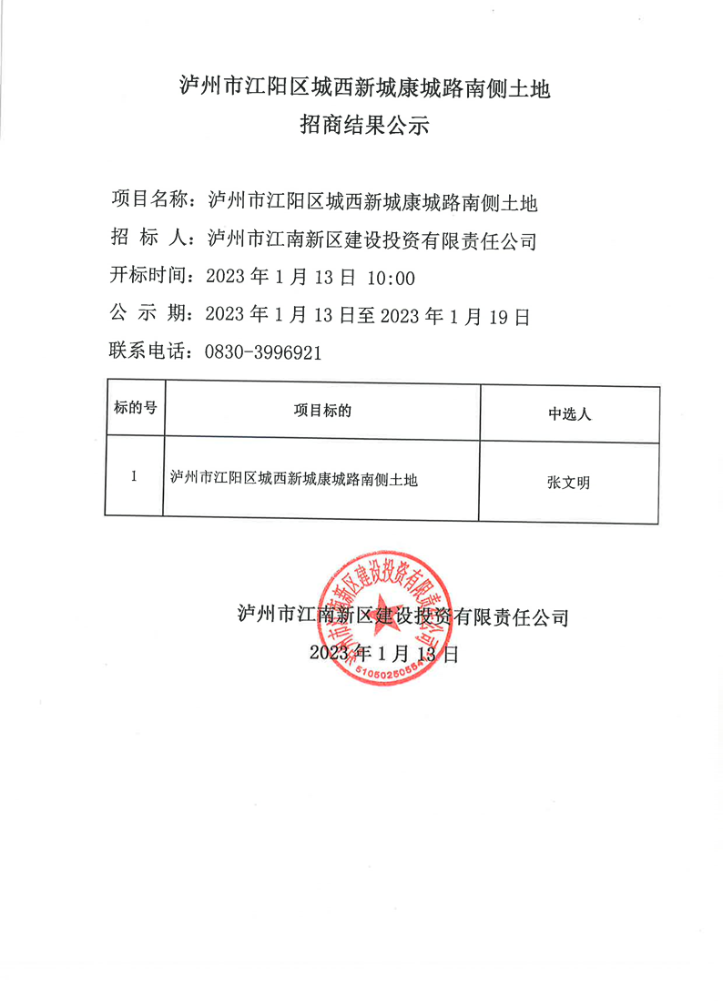 瀘州市江陽區(qū)城西新城康城路南側(cè)土地招商結(jié)果公示