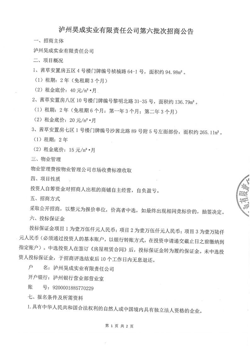 瀘州昊成實(shí)業(yè)有限責(zé)任公司第六批次招商公告