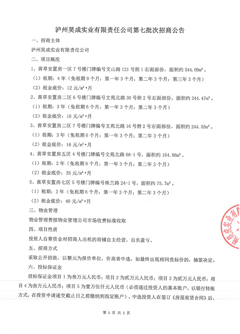 瀘州昊成實業(yè)有限責(zé)任公司第七批次招商公告