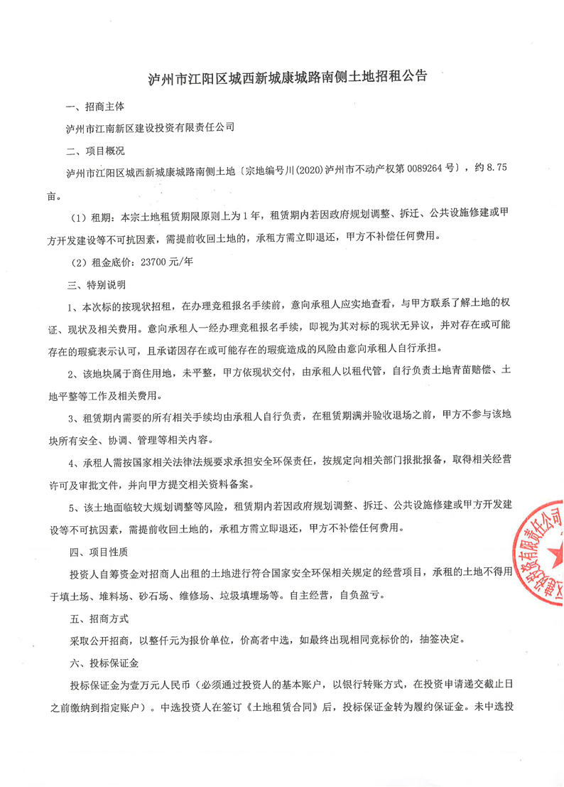瀘州市江陽區(qū)城西新城康城路南側(cè)土地招租公告