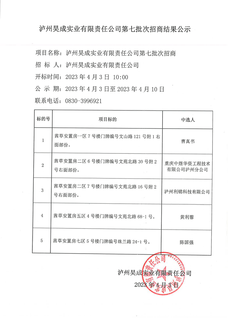瀘州昊成實業(yè)有限責任公司第七批次招商結果公示