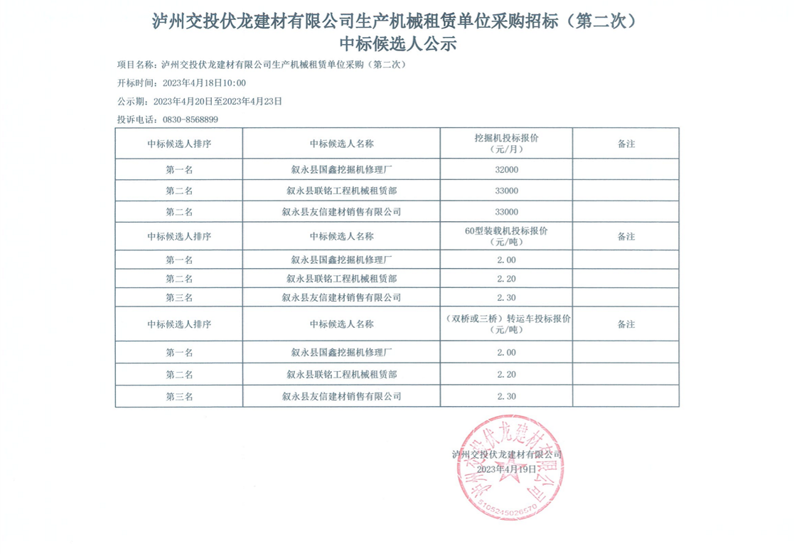 瀘州交投伏龍建材有限公司生產(chǎn)機械租賃單位采購招標(第二次)中標候選人公示