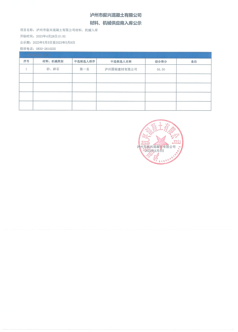 瀘州市敘興混凝土有限公司材料、機(jī)械供應(yīng)商入庫公示