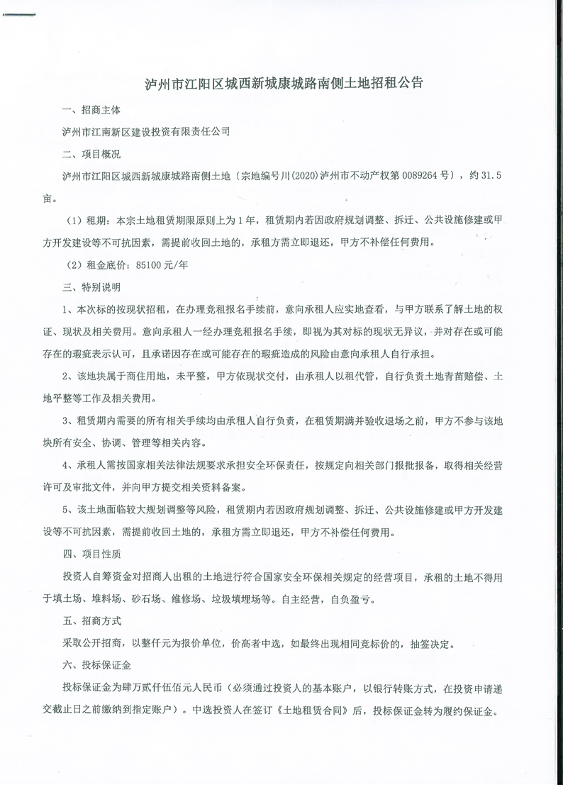 瀘州市江陽區(qū)城西新城康城路南側(cè)土地招租公告