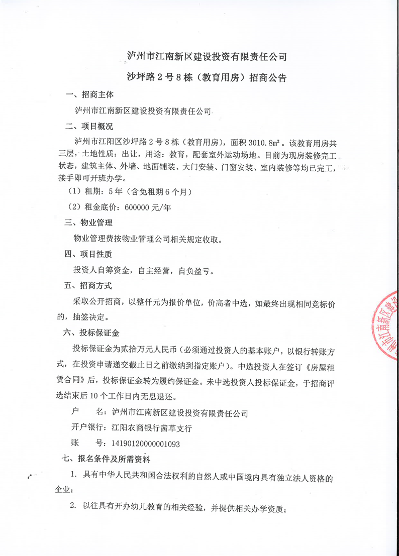 瀘州市江南新區(qū)建設投資有限責任公司沙坪路2號8棟(教育用房)招商公告