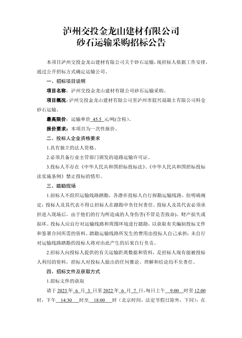 瀘州交投金龍山建材有限公司 砂石運(yùn)輸采購招標(biāo)公告