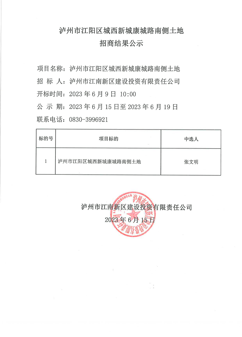 瀘州市江陽區(qū)城西新城康城路南側(cè)土地招商結(jié)果公示