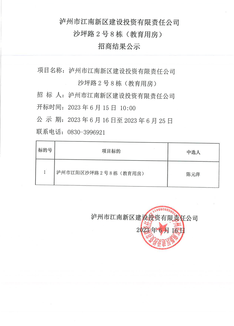 瀘州市江南新區(qū)建設投資有限責任公司沙坪路2號8棟(教育用地)招商結果公示