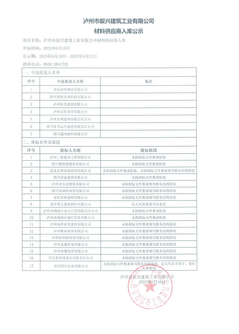 瀘州市敘興建筑工業(yè)有限公司材料供應(yīng)商入庫(kù)公示