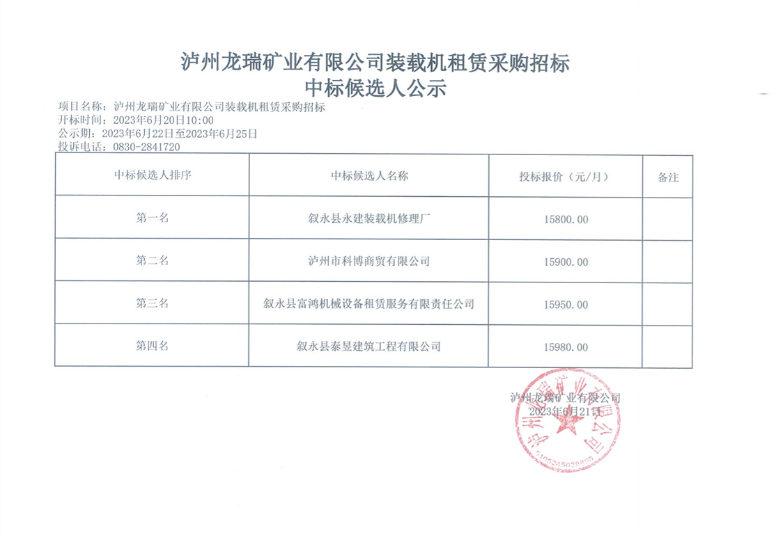 瀘州龍瑞礦業(yè)有限公司裝載機(jī)租賃采購招標(biāo)中標(biāo)候選人公示