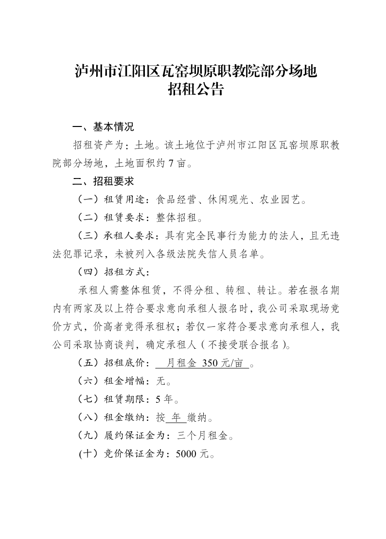 瀘州市江陽區(qū)瓦窯壩原職教院部分場地招租公告