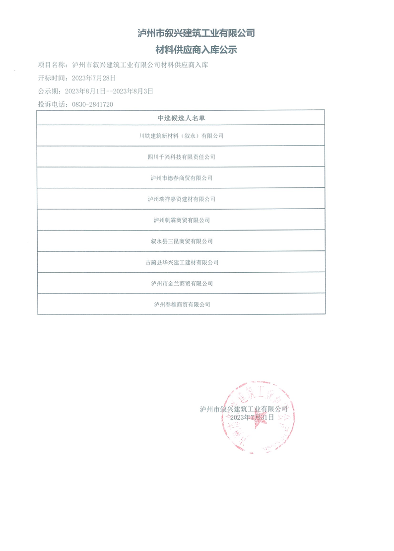 瀘州市敘興建筑有限公司材料供應(yīng)商入庫(kù)公示