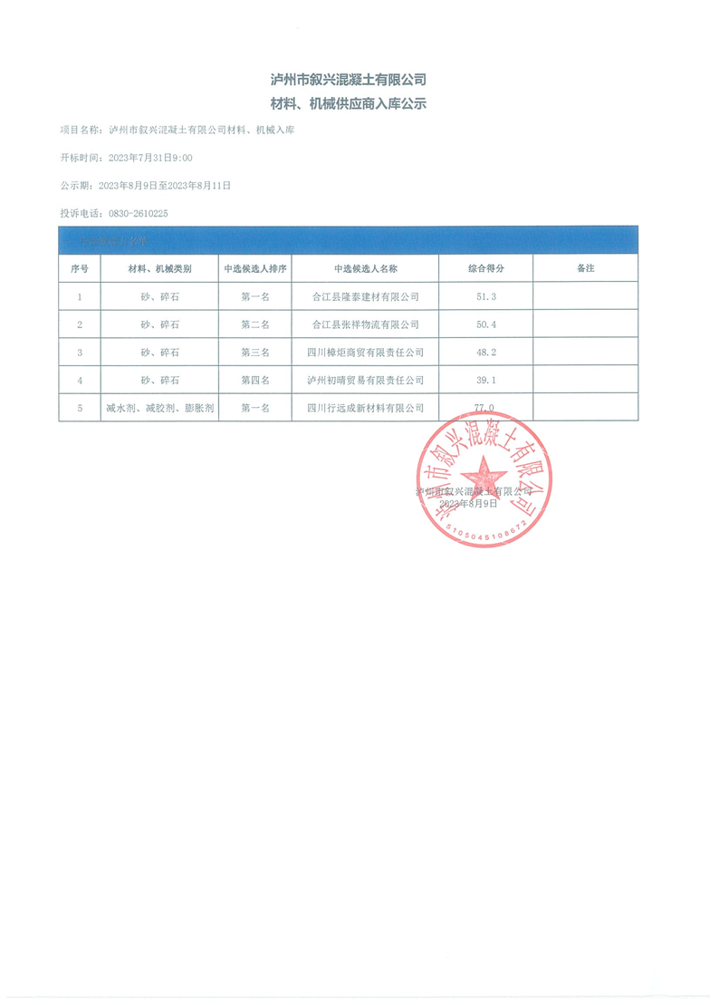 瀘州市敘興混凝土有限公司材料、機械供應商入庫公示