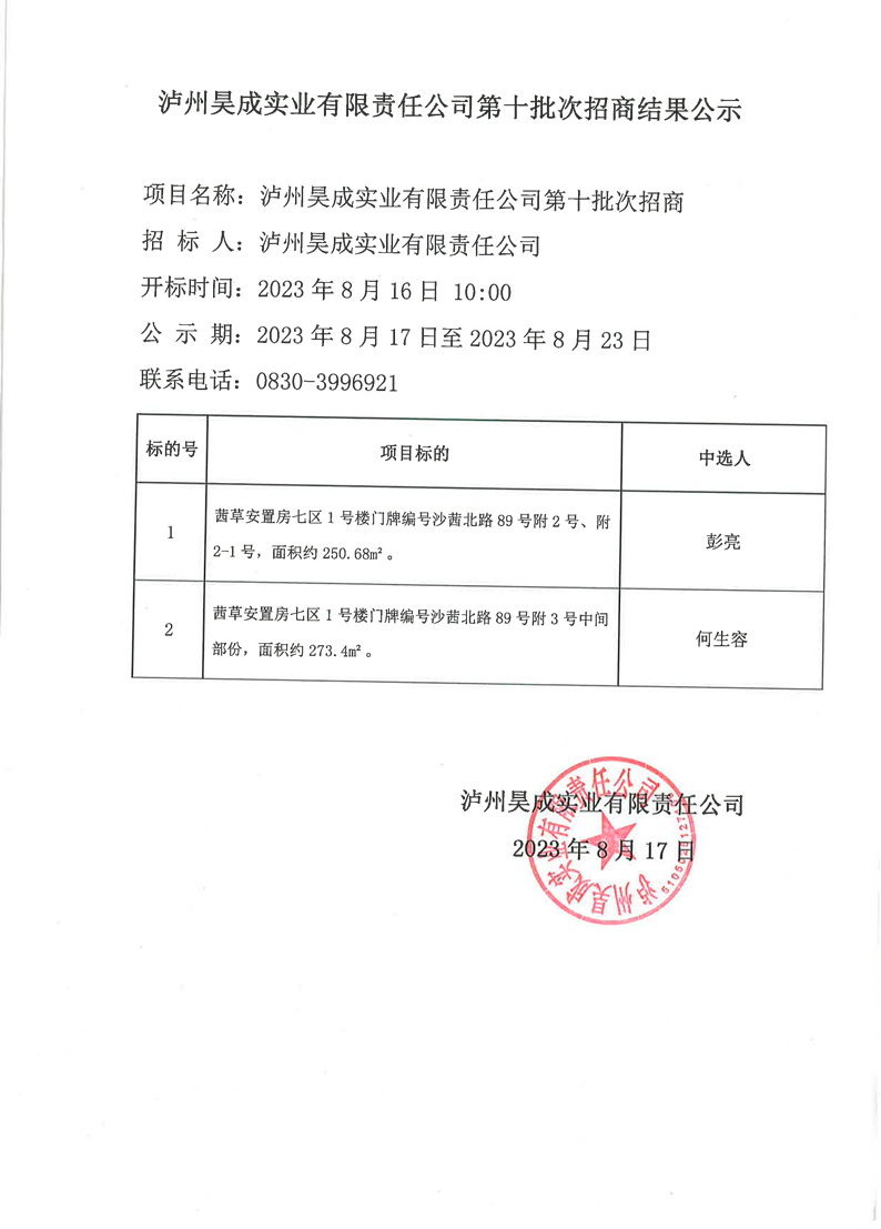 瀘州昊成實業(yè)有限責(zé)任公司第十批次招商結(jié)果公示
