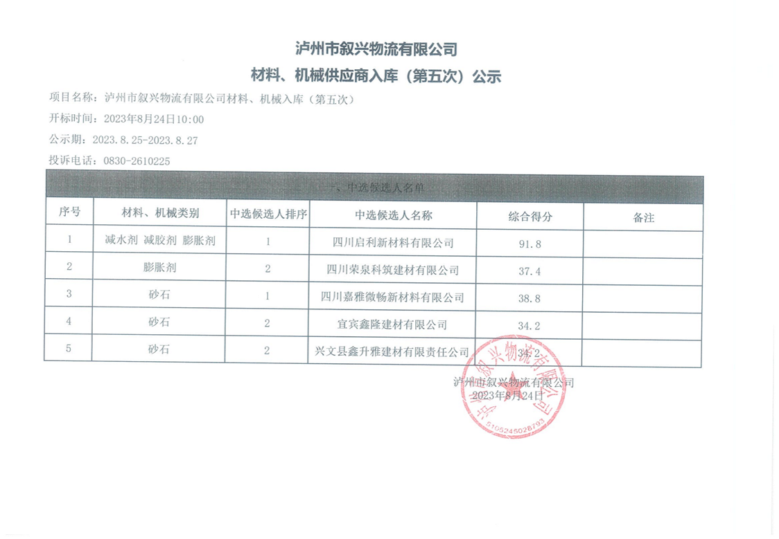 瀘州市敘興物流有限公司材料、機(jī)械供應(yīng)商入庫(kù)(第五次)公示
