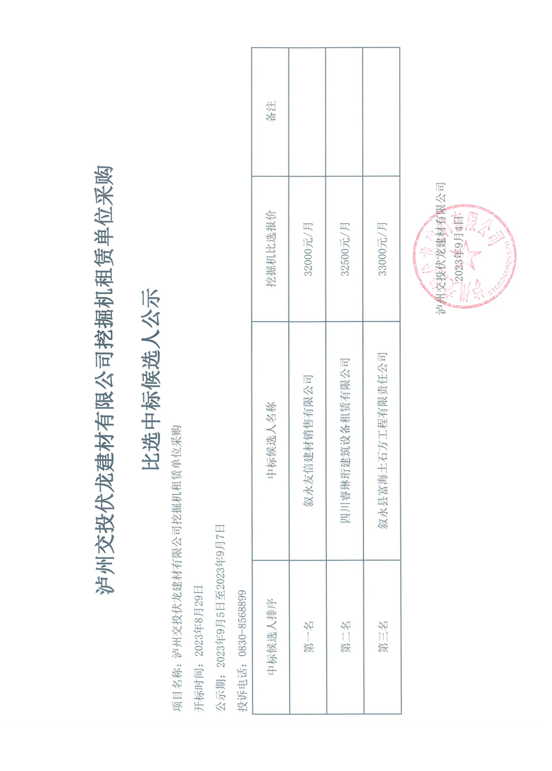 瀘州交投伏龍建材有限公司挖掘機(jī)租賃采購比選中標(biāo)候選人公示