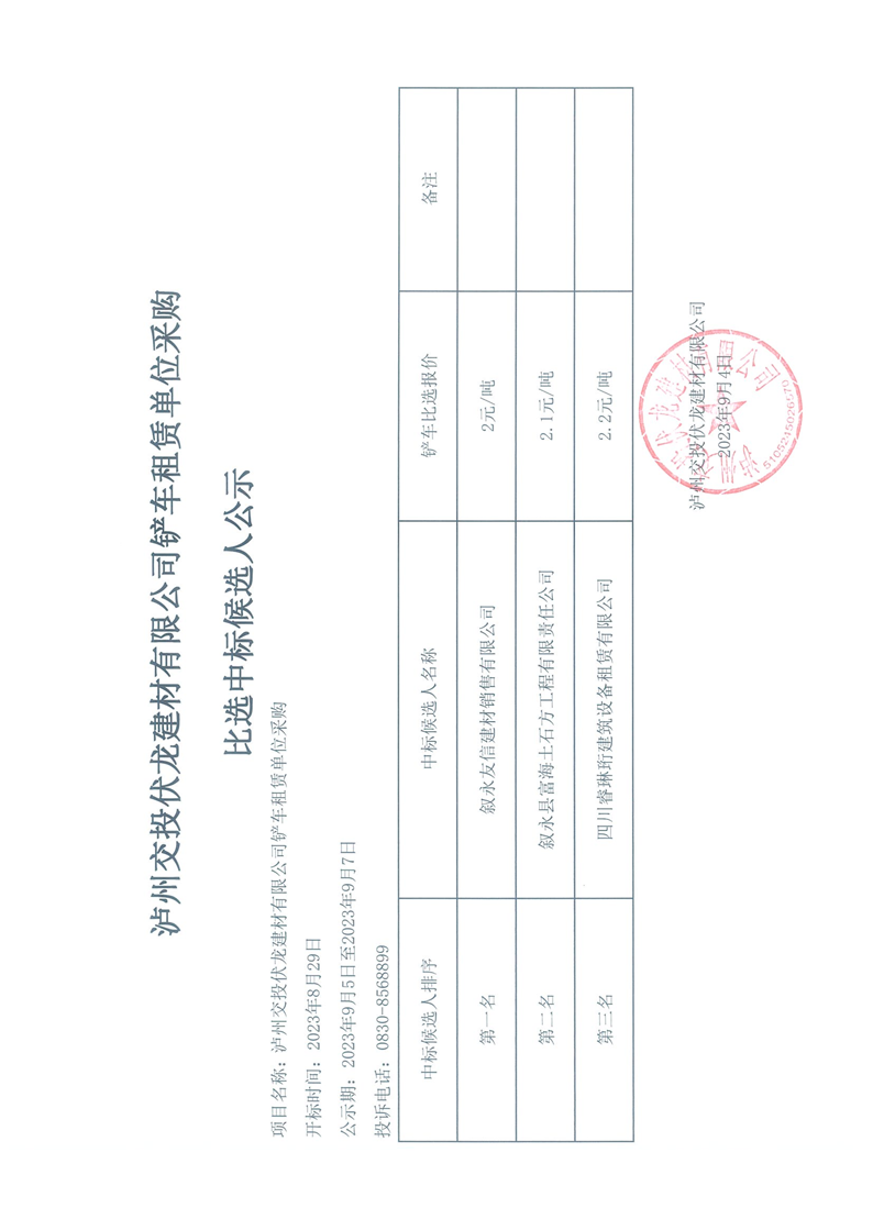 瀘州交投伏龍建材有限公司鏟車租賃采購比選中標(biāo)候選人公示