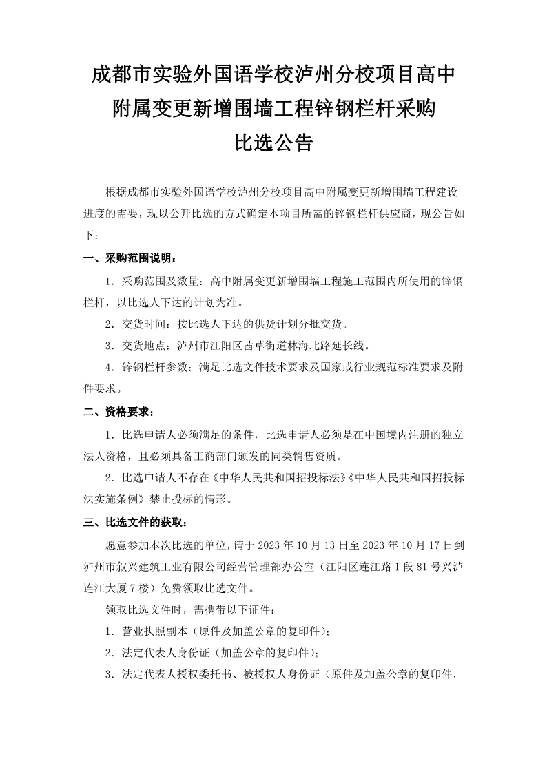 成都市實(shí)驗(yàn)外國(guó)語(yǔ)學(xué)校瀘州分校項(xiàng)目高中附屬變更新增圍墻工程鋅鋼欄桿采購(gòu)比選公告 作者: 來(lái)源: 日期:2023-10-12 瀏覽次數(shù): 次 【字體:小 大】 【打印正文】