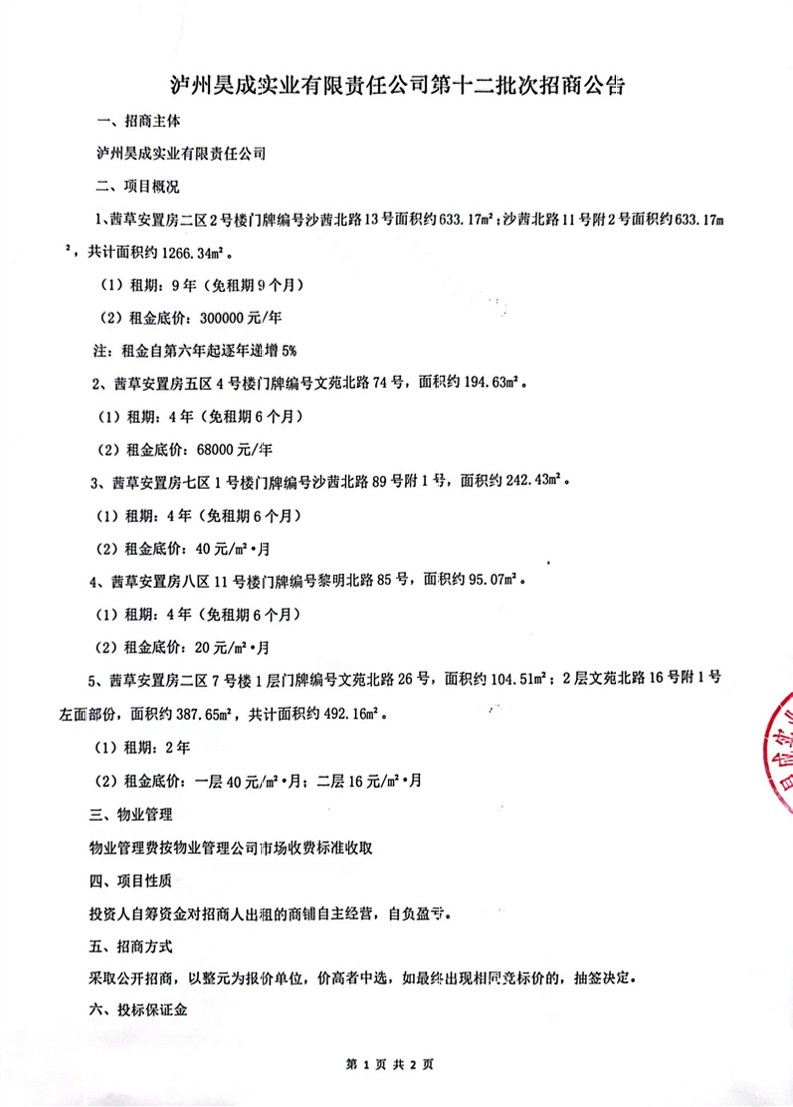 瀘州昊成實業(yè)有限責(zé)任公司第十二批次招商公告