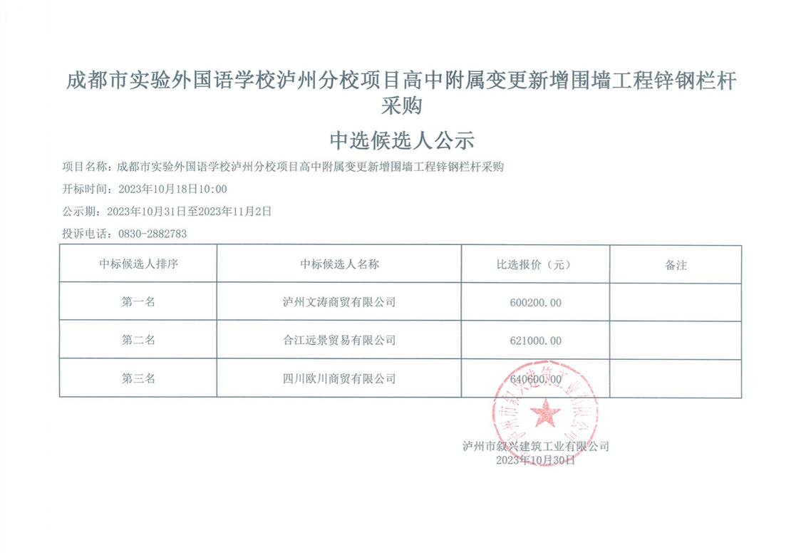 成都市實(shí)驗(yàn)外國語學(xué)校瀘州分校項(xiàng)目高中附屬變更新增圍墻工程鋅鋼欄桿采購中選候選人公示