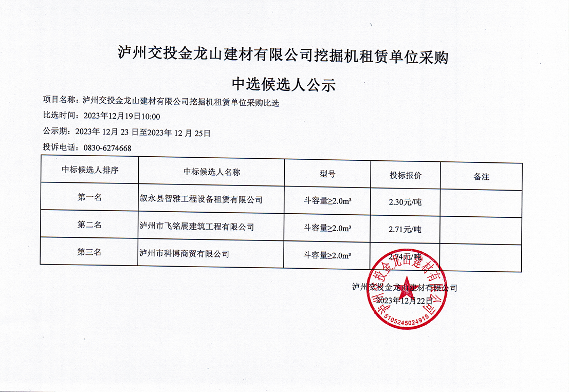 瀘州交投金龍山建材有限公司挖掘機租賃單位采購中選候選人公示