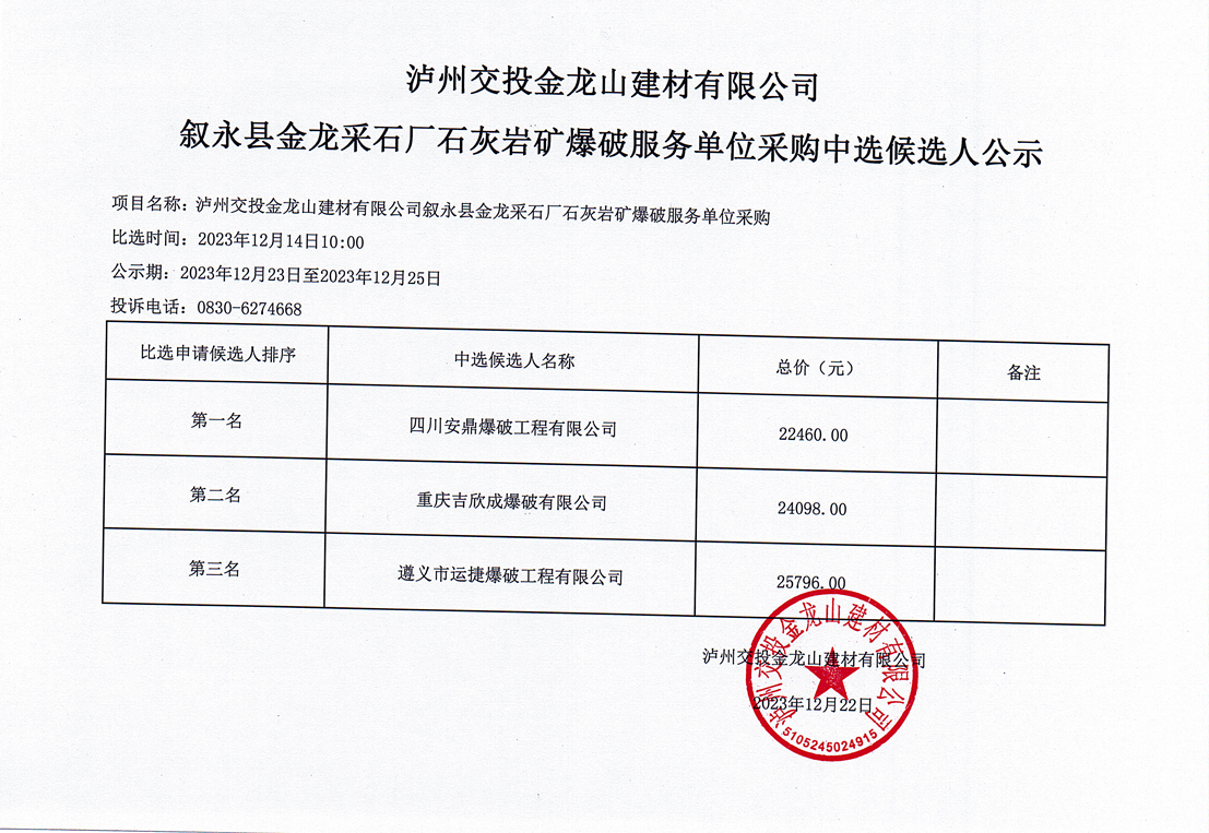 瀘州交投金龍山建材有限公司敘永縣金龍采石廠石灰?guī)r礦爆破服務(wù)單位采購(gòu)中選候選人公示 作者: 來(lái)源: 日期:2023-12-22 瀏覽次數(shù): 次 【字體:小 大】 【打印正文】