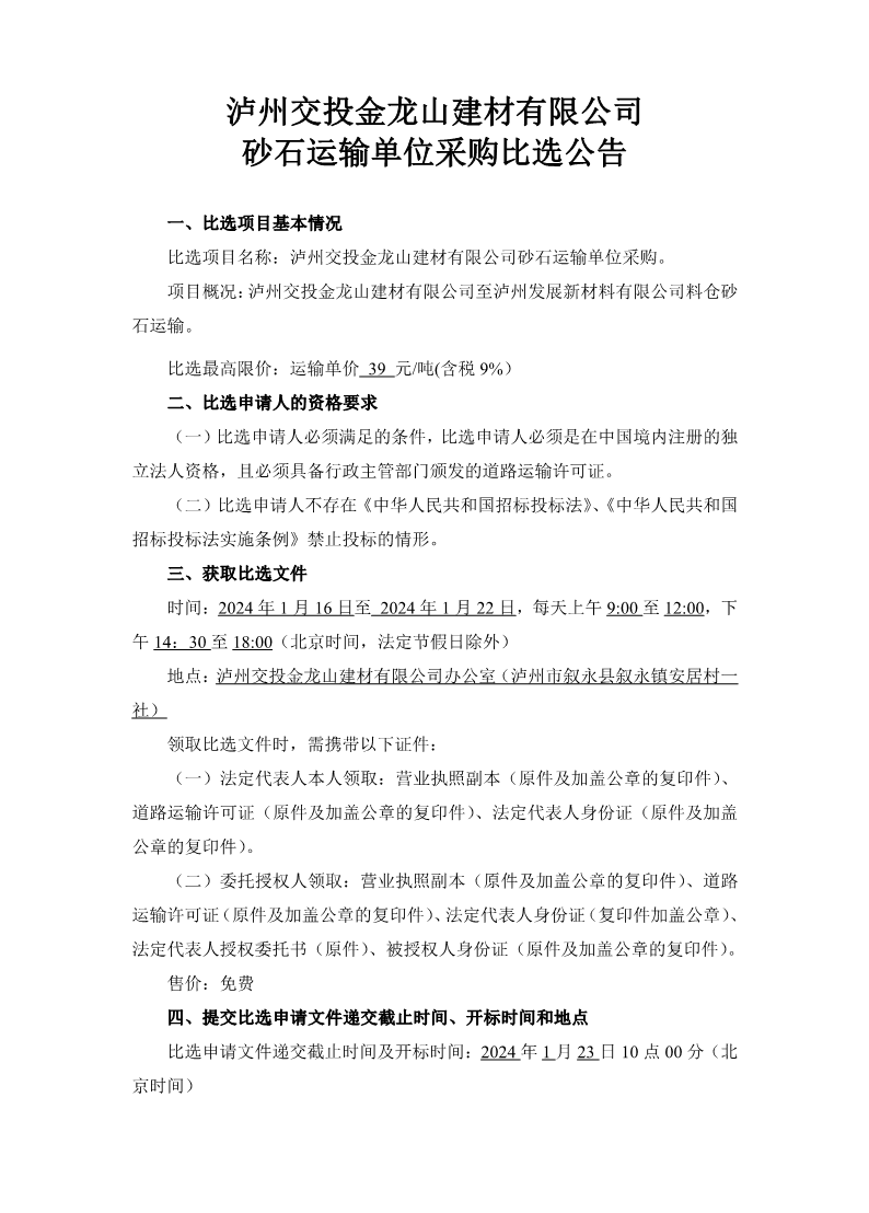 瀘州交投金龍山建材有限公司砂石運(yùn)輸單位采購(gòu)比選公告