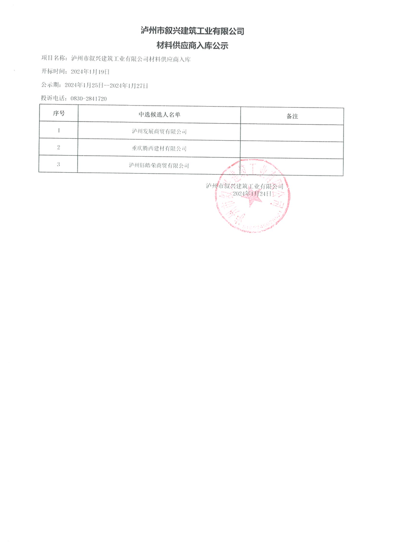 瀘州市敘興建筑工業(yè)有限公司材料供應(yīng)商入庫公示
