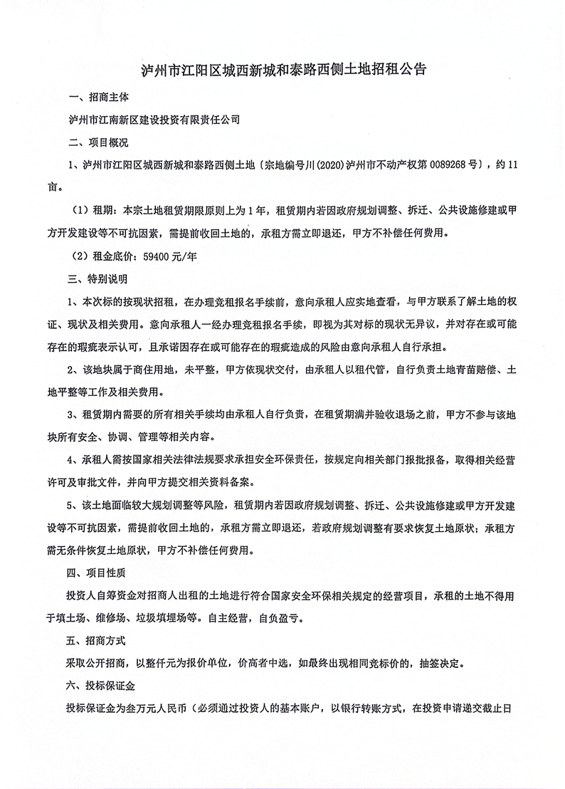 瀘州市江陽區(qū)城西新城和泰路西側(cè)土地招租公告