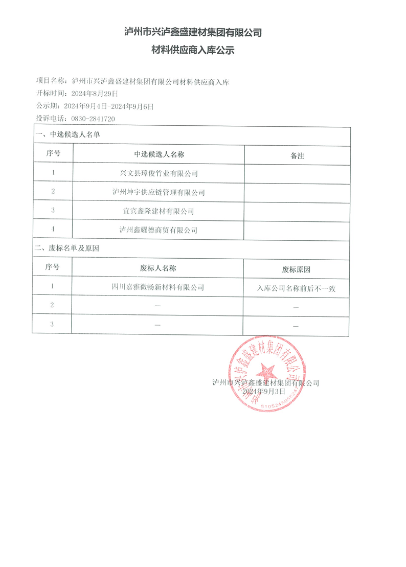瀘州市興瀘鑫盛建材集團(tuán)有限公司材料供應(yīng)商入庫公示