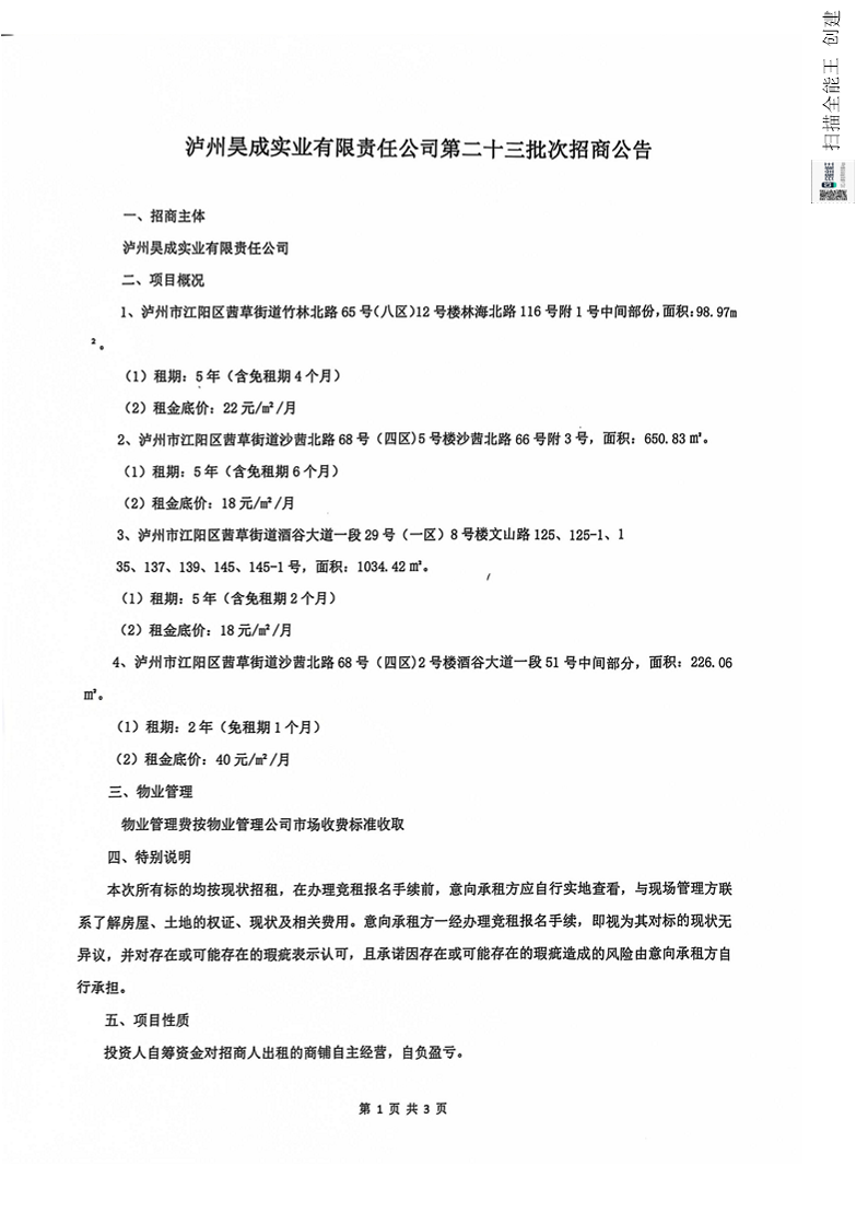 瀘州市昊成實業(yè)有限責(zé)任公司第二十三批次招商公告