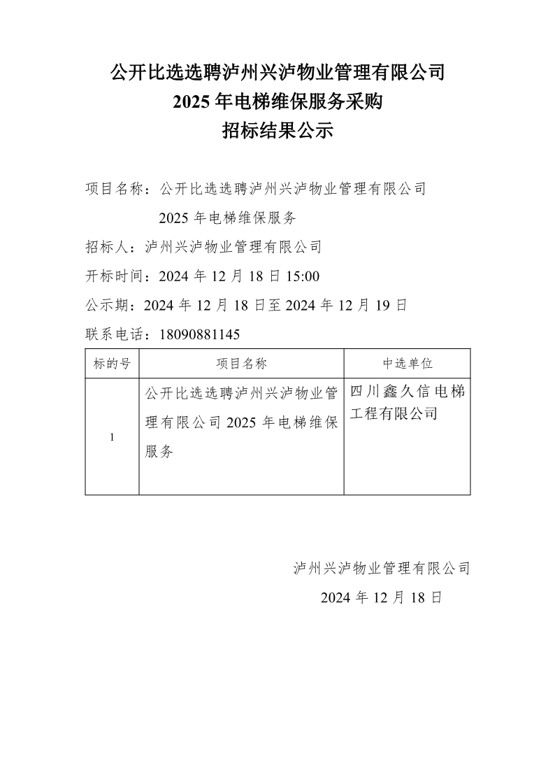 公開(kāi)比選選聘瀘州興瀘物業(yè)管理有限公司2025年電梯維保服務(wù)采購(gòu)招標(biāo)結(jié)果公示 作者: 來(lái)源: 日期:2024-12-18 瀏覽次數(shù): 次 【字體:小 大】 【打印正文】