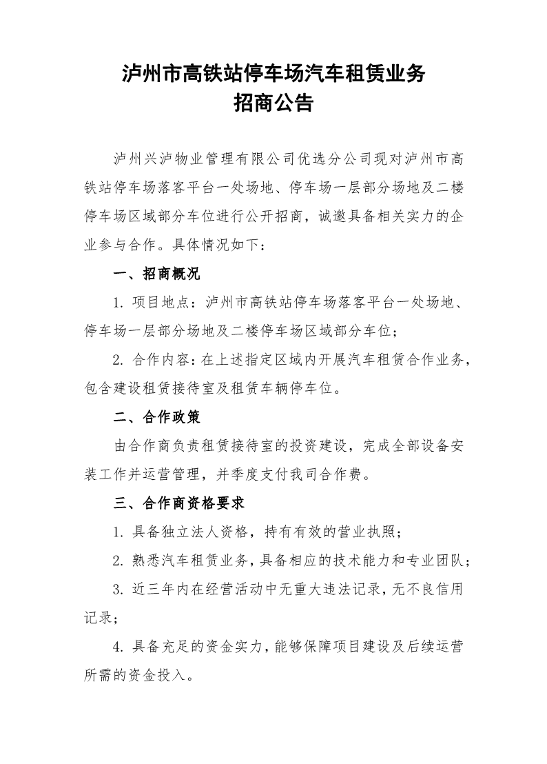 瀘州市高鐵站停車(chē)場(chǎng)汽車(chē)租賃業(yè)務(wù)招商公告