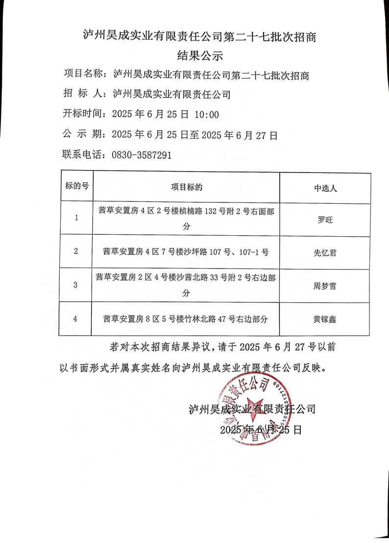 瀘州昊成實業(yè)有限責任公司第二十七批次招商結(jié)果公示