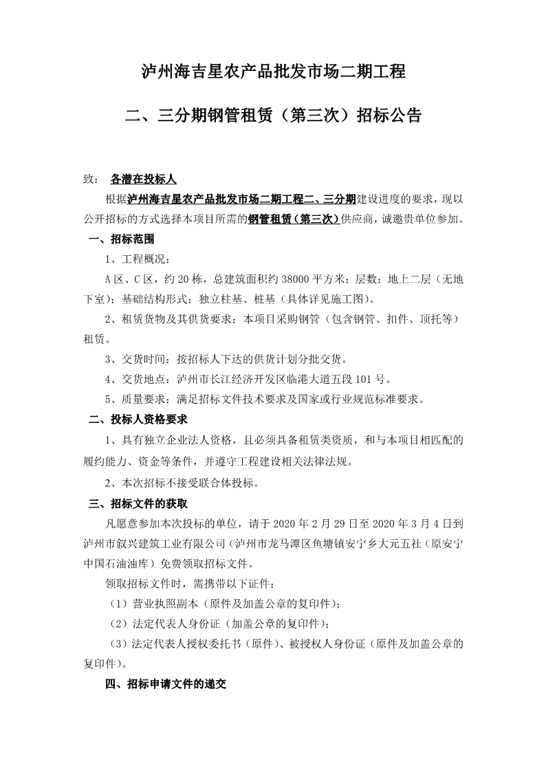 瀘州海吉星農(nóng)產(chǎn)品批發(fā)市場(chǎng)二期工程二三分期鋼管租賃(第三次)招標(biāo)公告 作者: 來源: 日期:2020-02-28 瀏覽次數(shù): 次 【字體:小 大】 【打印正文】