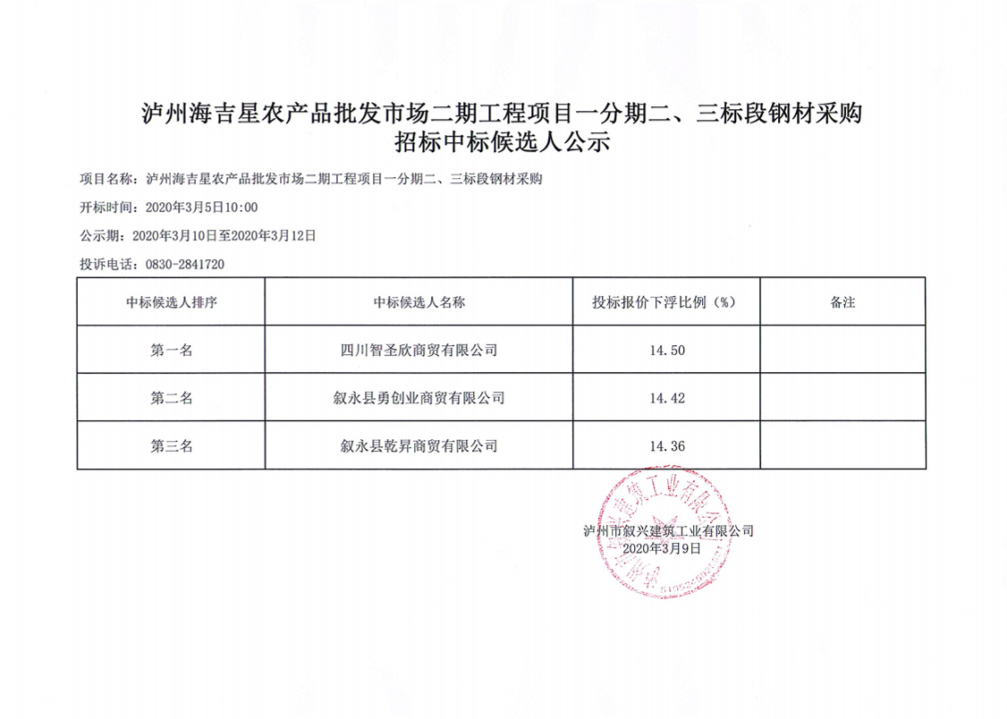 瀘州海吉星農(nóng)產(chǎn)品批發(fā)市場二期項目一分期二、三標(biāo)段鋼材采購招標(biāo)中標(biāo)候選人公示 作者: 來源: 日期:2020-03-09 瀏覽次數(shù): 次 【字體:小 大】 【打印正文】