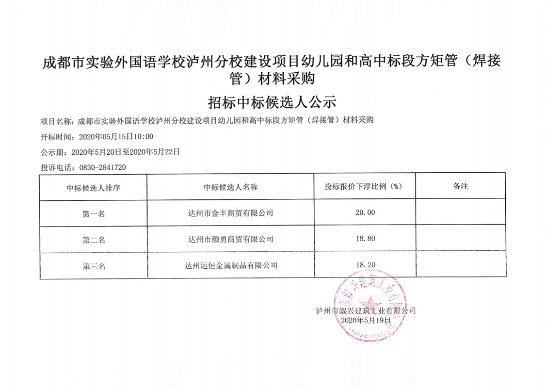 成都市實(shí)驗(yàn)外國(guó)語(yǔ)學(xué)校瀘州分校建設(shè)項(xiàng)目幼兒園和高中標(biāo)段方矩管(焊接管)材料采購(gòu)招標(biāo)中標(biāo)候選人公示 作者: 來(lái)源: 日期:2020-05-19 瀏覽次數(shù): 次 【字體:小 大】 【打印正文】