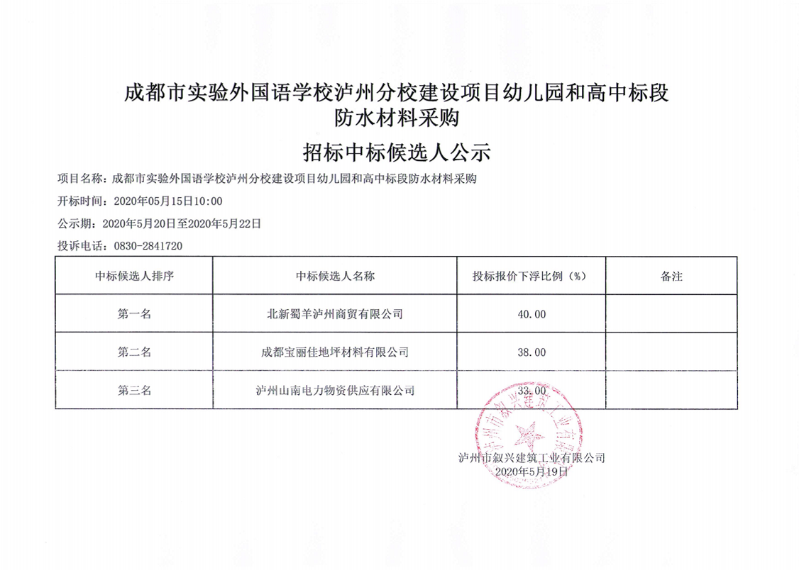 成都市實驗外國語學(xué)校瀘州分校建設(shè)項目幼兒園和高中標(biāo)段防水材料采購招標(biāo)中標(biāo)候選人公示 作者: 來源: 日期:2020-05-19 瀏覽次數(shù): 次 【字體:小 大】 【打印正文】