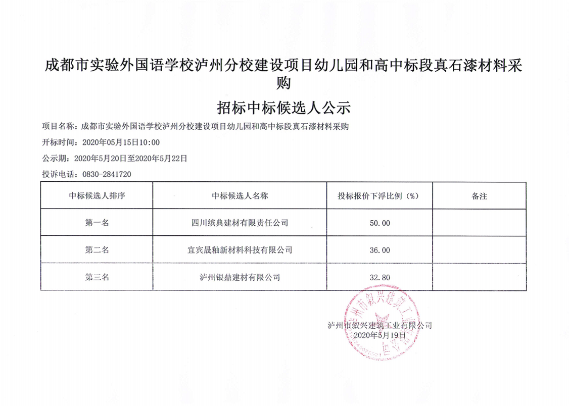 成都市實(shí)驗(yàn)外國語學(xué)校瀘州分校建設(shè)項(xiàng)目幼兒園和高中標(biāo)段真石漆材料采購招標(biāo)中標(biāo)候選人公示 作者: 來源: 日期:2020-05-19 瀏覽次數(shù): 次 【字體:小 大】 【打印正文】
