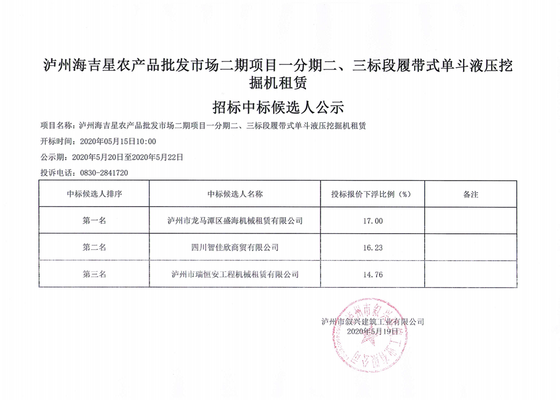 瀘州海吉星農(nóng)產(chǎn)品批發(fā)市場二期項目一分期二、三標段履帶式單斗液壓挖掘機租賃招標中標候選人公示 作者: 來源: 日期:2020-05-19 瀏覽次數(shù): 次 【字體:小 大】 【打印正文】