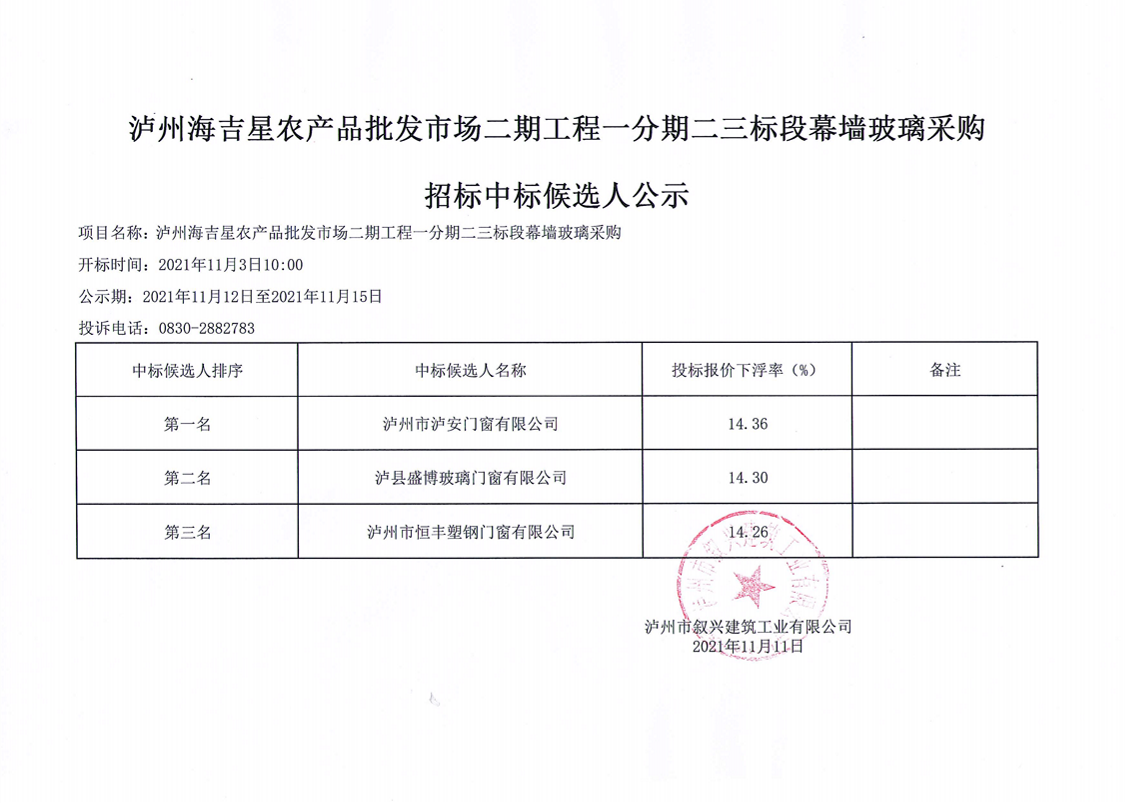 瀘州海吉星農(nóng)產(chǎn)品批發(fā)市場(chǎng)二期工程一分期二三標(biāo)段幕墻玻璃采購招標(biāo)中標(biāo)候選人公示 作者: 來源: 日期:2021-11-11 瀏覽次數(shù): 次 【字體:小 大】 【打印正文】