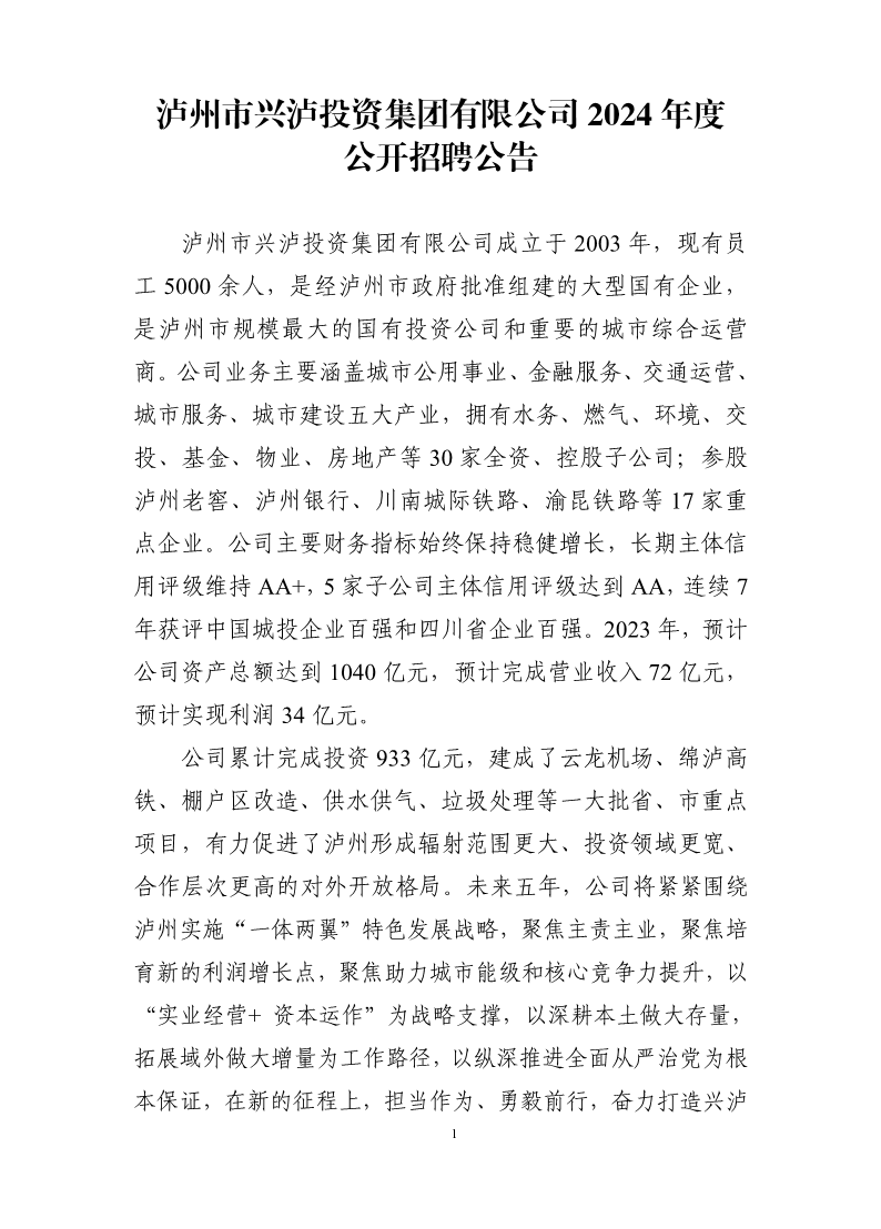 瀘州市興瀘投資集團有限公司2024年度公開招聘公告 作者: 來源: 日期:2024-03-08 瀏覽次數(shù): 次 【字體:小 大】 附件:瀘州市興瀘投資集團有限公司2024年度公開招聘崗位職責和任職條件.pdf 【打印正文】