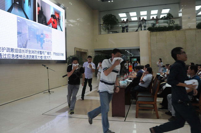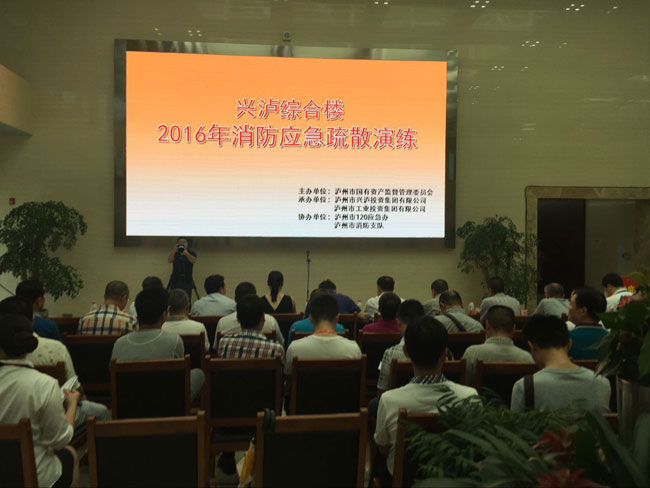 下午16時30分演練開始,興瀘集團啟動了應急預案,并采取對應措施,組織人員緊急疏散。疏散人員沿著大樓消防樓梯,使用濕毛巾捂住口鼻,彎腰有序地撤離火災現(xiàn)場;消防官兵使用搶險車、水罐車、登高噴射車展開滅火戰(zhàn)斗,幫助被困人員使用大樓緩降器成功逃生;市120應急辦緊急調(diào)動救護車趕到演練現(xiàn)場,對“受傷”人員進行緊急救護。經(jīng)過十多分鐘緊張滅火救援,大樓所有人員安全轉(zhuǎn)移。